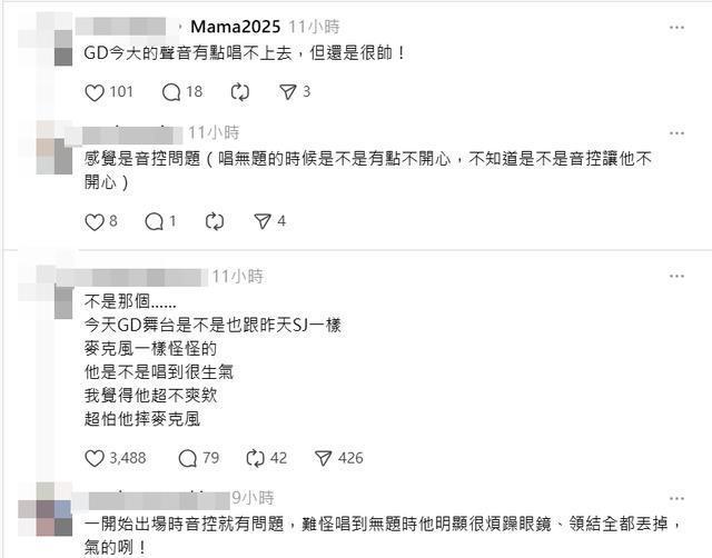 记者田暐玮/综合报导 天王GD(G-DRAGON)29日在MAMA颁奖典礼上带来压轴演出,却疑似舞台设备及流程频频出包,导致演出失常,他被拍到多次面露不悦,之后更直接回了MAMA官方一个「倒赞」,表达心中极大不满引发议论。 GD当时在舞台上出现了设备异常的情况,疑似是耳麦及收音出问题,不只直播播出的声音相当灾难,他在演唱过程中也多次把耳机摘了又戴,露出不悦神情,频频扭动脖颈和翻白眼等肢体语言表达不满,有粉丝表示,前一天SuperJunior演出时就已经出现设备异常,主办方却毫无应对修正。
