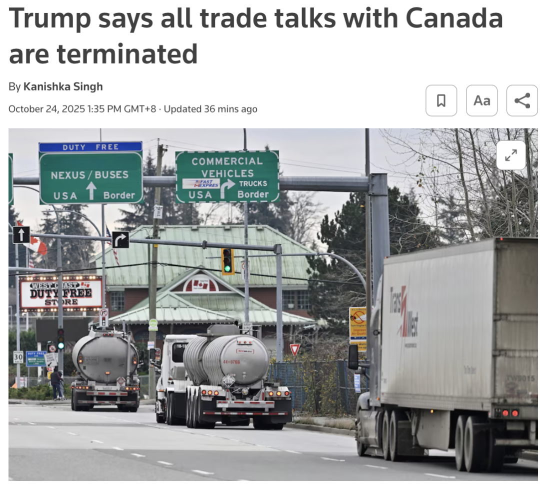 特朗普在社交平台“真相社交”上发文称:“鉴于他们极其恶劣的行为,现宣布终止与加拿大的所有贸易谈判。”